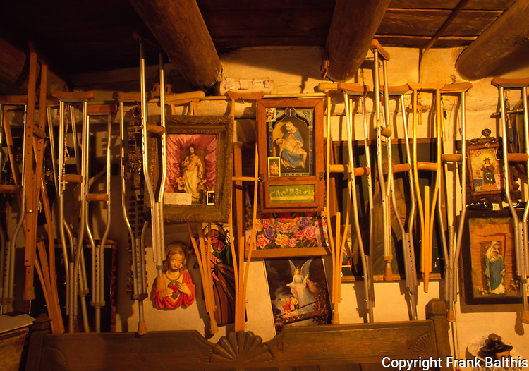 Faith healing by mud in Santa Fe, New Mexico. A church full of discarded crutches and sunnies. You too could walk again, see again, by going to this church only once.